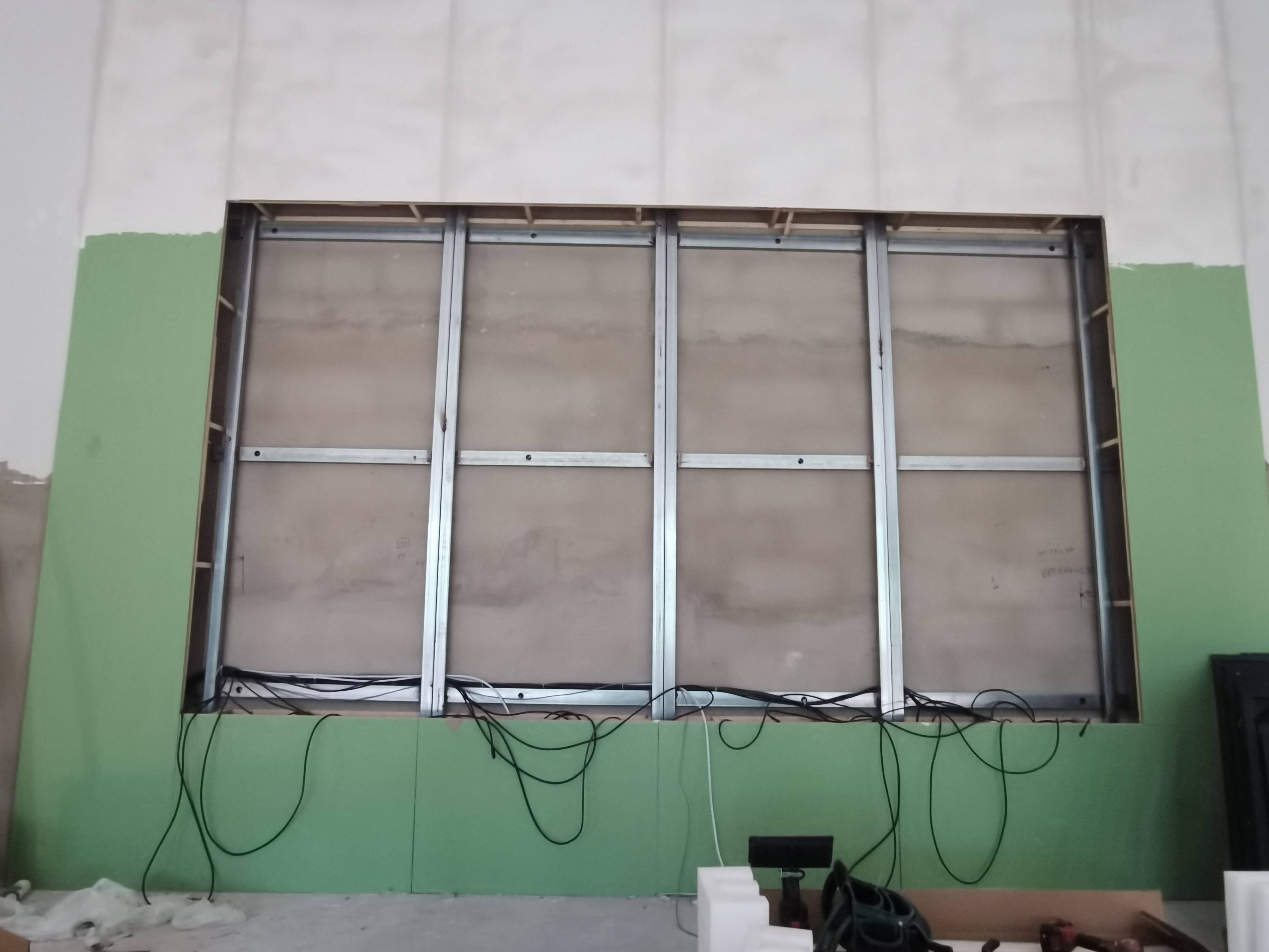 细节最见功夫:安装前就预留好尺寸,给设备和支架留足空间。后续装修时,墙面贴砖、刷漆不用“迁就”设备,最后屏嵌进墙里和墙面齐平,看着特整洁;电源线、信号线还能提前埋进墙里,不裸露更安全,也不怕学生碰着。甚至能在屏周边装实训展板、氛围灯,和校园文化融在一起,不像硬生生“贴”上去的。