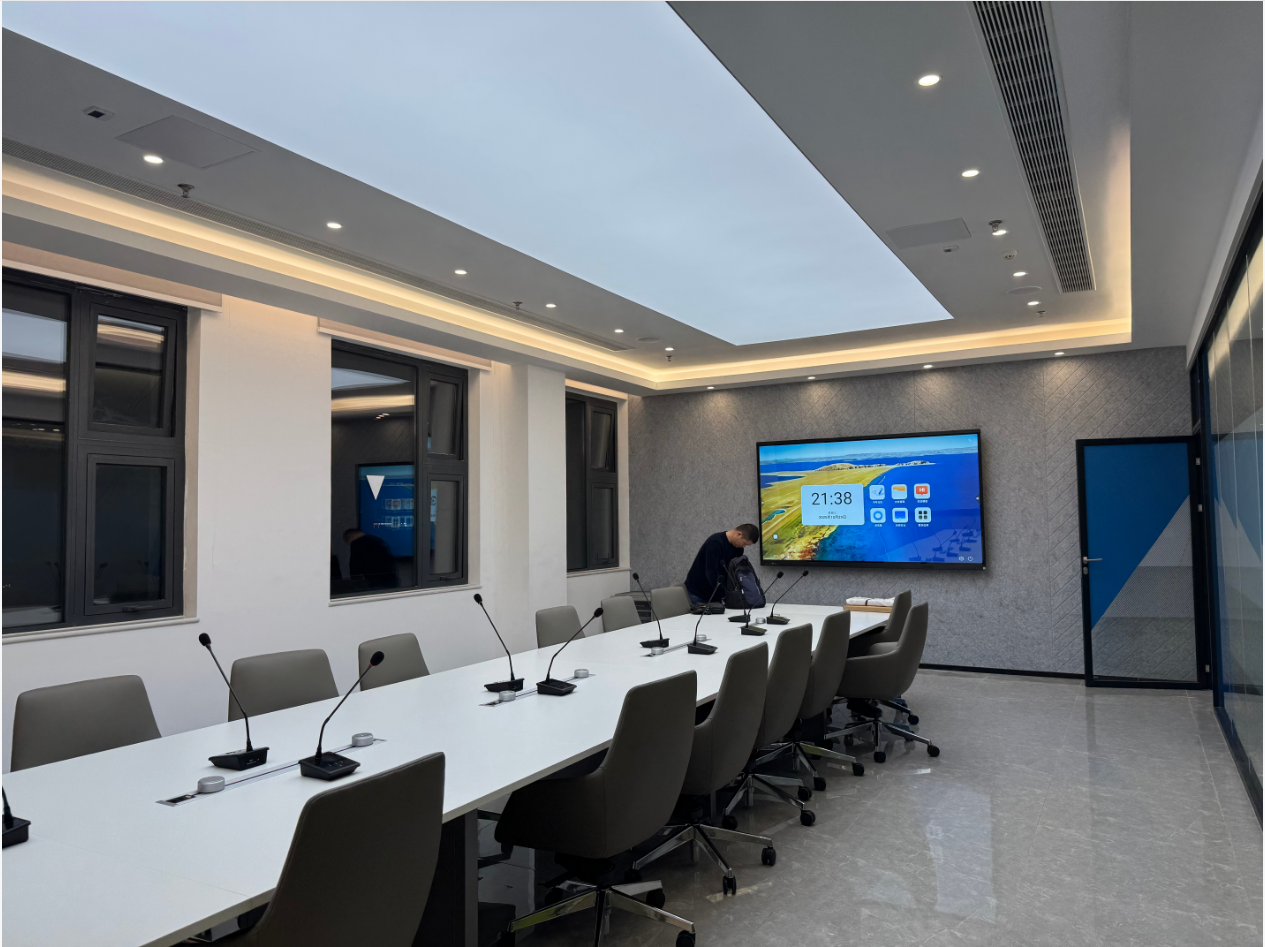 会议室则实现全场景智能协作升级,100 寸会议平板采用 4K 超清显示,广色域精准呈现设计方案与数据图表。通过双系统一键切换功能,支持多终端无线投屏与零贴合流畅书写,配合 8 阵列麦克风与专业音响系统,15 米内人声清晰拾取,智能降噪技术有效保障远程会议质量。设备间通过中控系统实现互联互通,大幅提升会商效率。